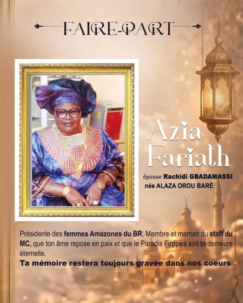 Figure à la fois discrète et influente, la défunte laisse le souvenir d’une femme engagée, tout à la fois pilier familial et actrice déterminante de l’entourage politique de son époux. Par cette disparition, c’est une trajectoire de complicité, de fidélité et de combats partagés qui s’interrompt pour l’ancien maire de Parakou.