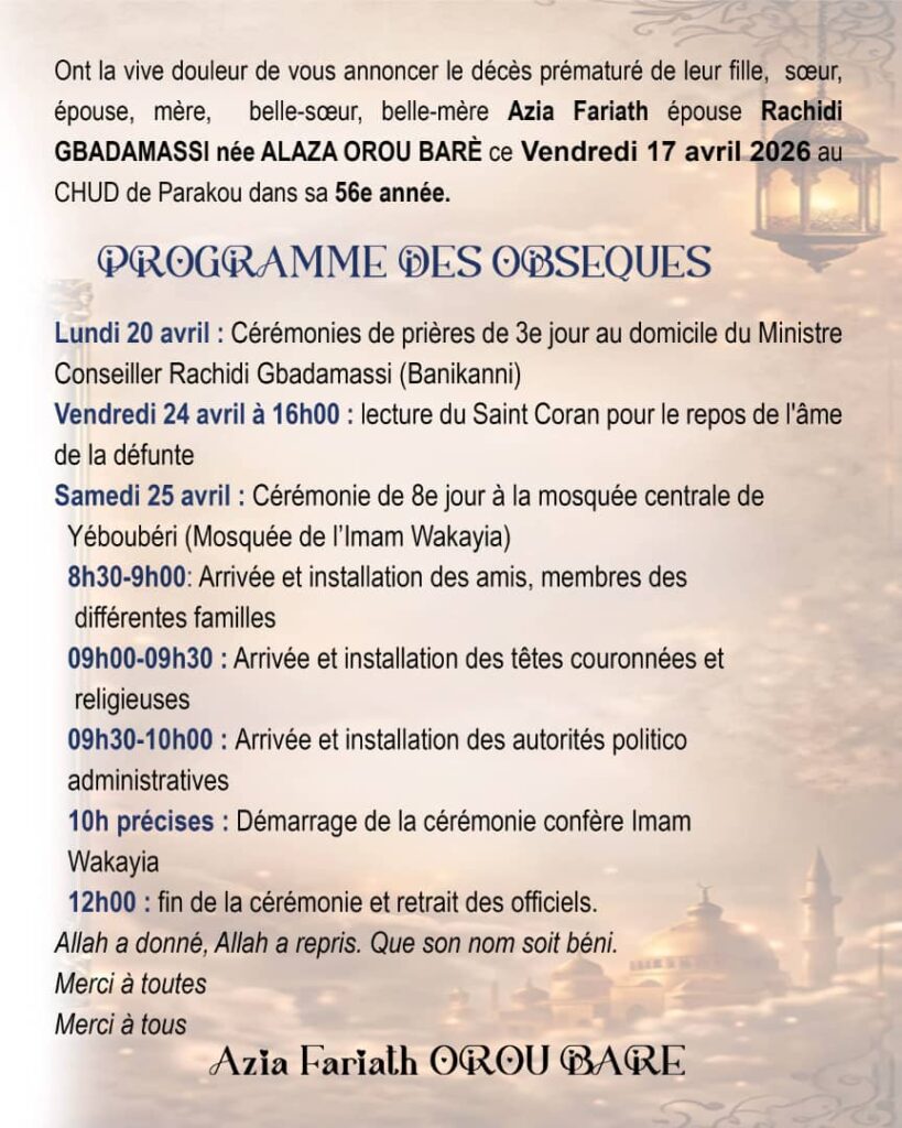 En attendant la cérémonie du 8ᵉ jour, prévue pour se tenir le samedi 25 avril 2026 à la mosquée centrale de Yéboubéri (Mosquée de l’Imam Wakayia), Rachidi Gbadamassi demeure résolu à préserver l’héritage moral et le capital politique laissés par son épouse, lesquels s’articulent autour de valeurs cardinales que sont le courage, la constance et la loyauté en toutes circonstances.