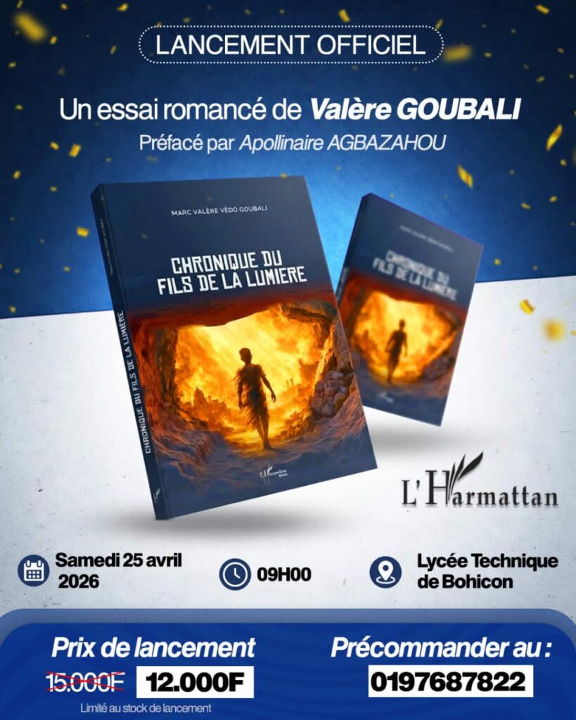 Le compte à rebours est lancé. À trois jours de la sortie officielle de Chronique du Fils de la Lumière, l’effervescence monte autour de l’œuvre signée Marc Valère Vèdo GOUBALI. Prévu pour le samedi 25 avril 2026 au Lycée Technique de Bohicon à 09h00, le lancement s’annonce comme un rendez-vous littéraire majeur, à la croisée de la réflexion, de l’engagement et de l’expression citoyenne.